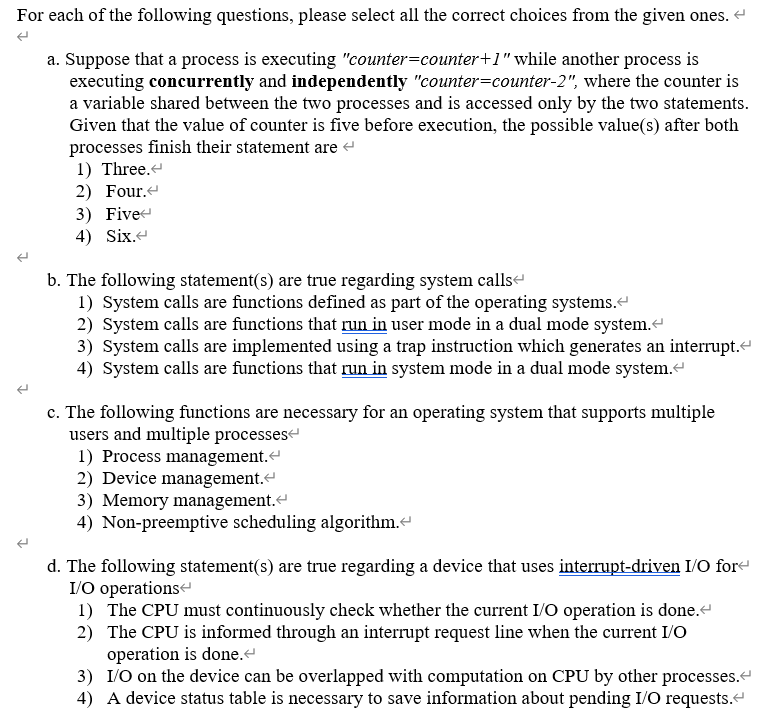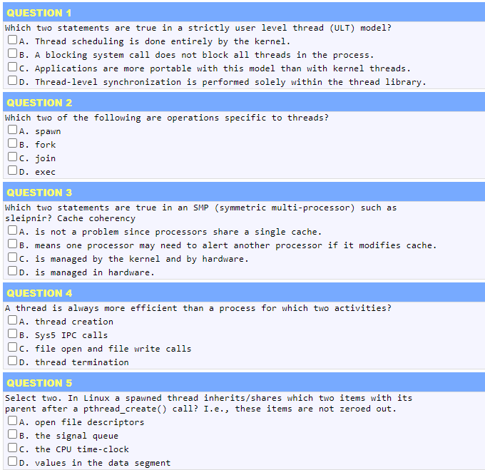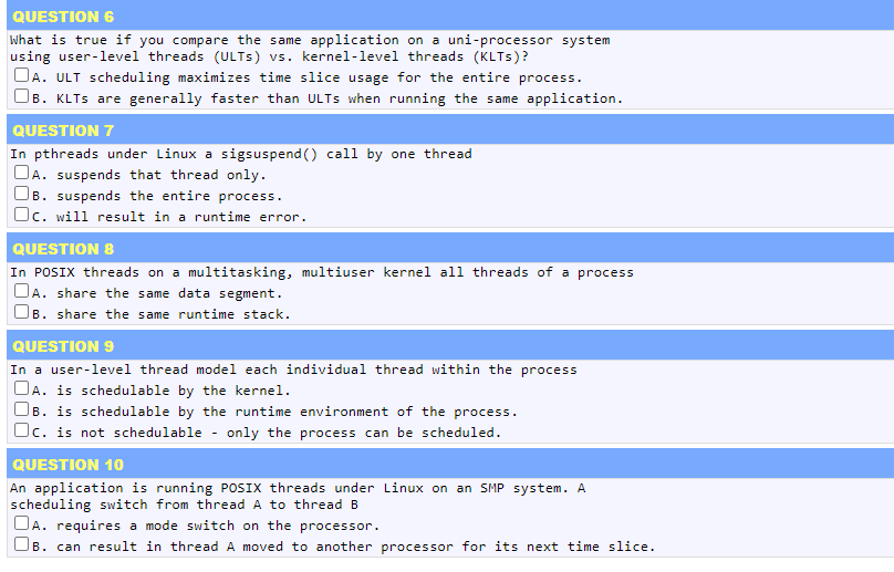 These java multiple choice interview questions asked in various java interview exams. B An asynchronous message has the same effect as a blocking call. A An asynchronous message does not cause the invoking operation to halt execution while it awaits the return of control. Ordinary pipes in UNIX require a parent-child relationship between the communicating processes. True or False. Multithreading on a multi. For short-term scheduler Which of the following stands True i.